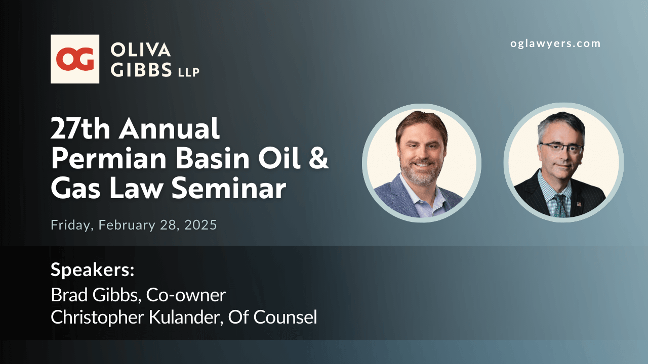 Oliva Gibbs Co-owner Brad Gibbs and Of Counsel Christopher Kulander will speak at the 27th Annual Permian Basin Oil & Gas Seminar in Midland, TX. Brad will present on NPRI apportionment, using examples from Pich v. Lankford et al, and Professor Kulander will speak about cotenants, particularly in the Cromwell v. Anadarko case.