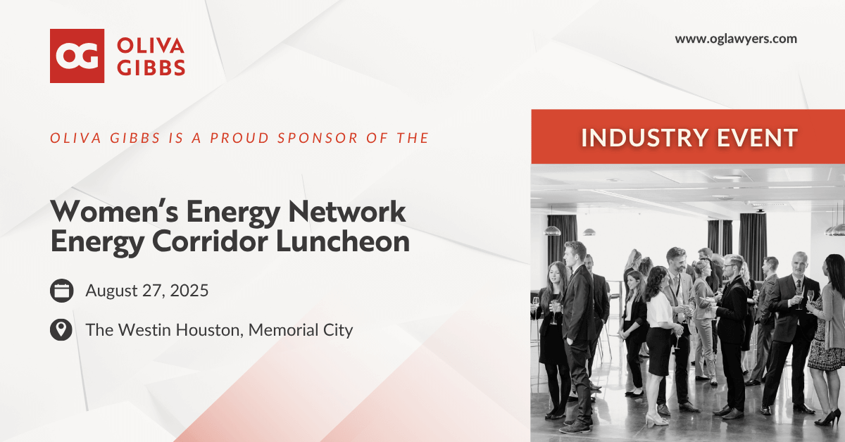 Date: Wednesday, August 27, 2025 Time: 11:30 a.m. – 1 p.m. CDT Location: The Westin Houston, Memorial City | 945 Gessner Rd., Houston, TX 77024 Oliva Gibbs is proud to sponsor the Women's Energy Network – Houston Chapter's August luncheon. Meet the OG team and network with other energy industry professionals, plus learn about the […]